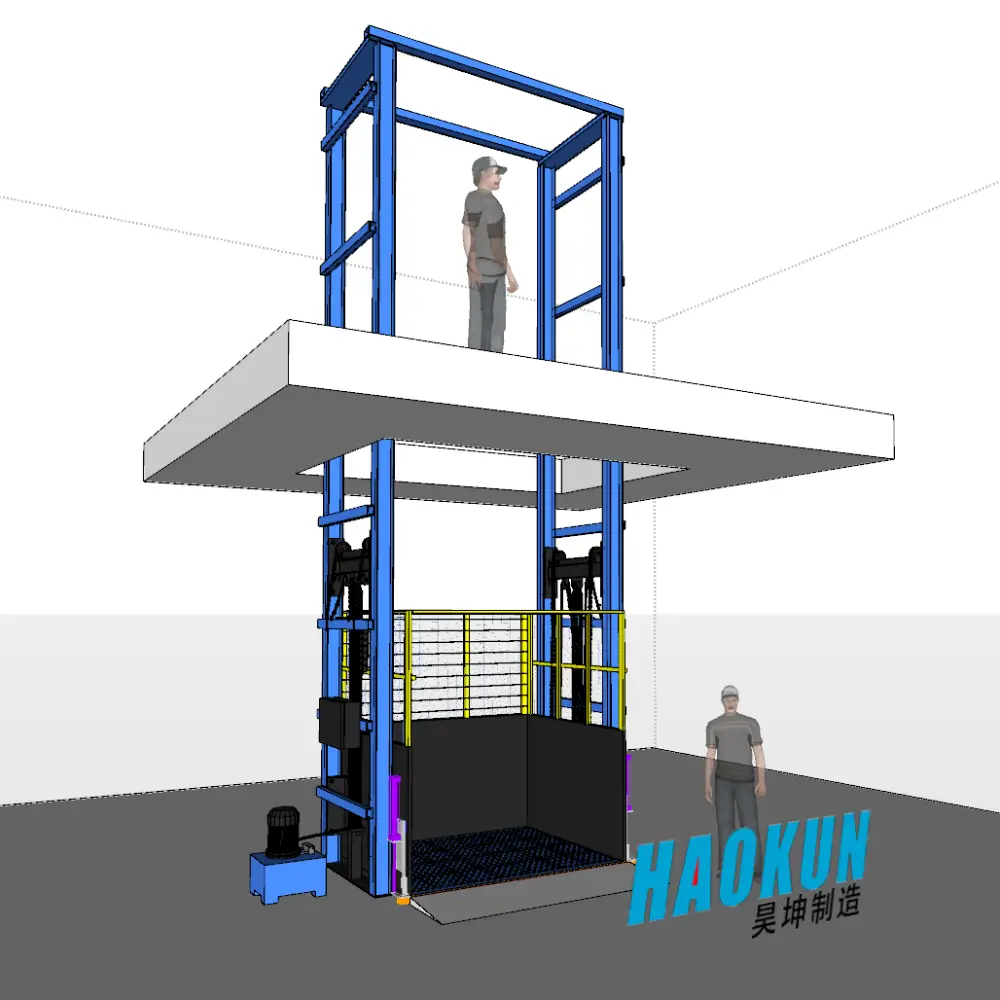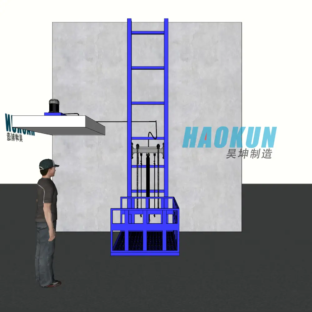 This Haokun Small Single Guide Rail Cargo Lift features a single hydraulic cylinder drive structure, offering a compact design and stable